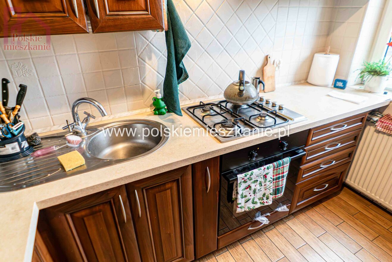 - kuchnia wyposażona w meble, stół, piekarnik w zabudowie, kuchenka gazowa, zlew,