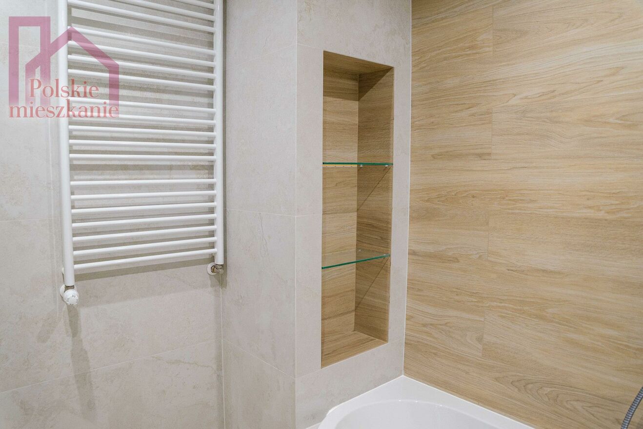 - łazienka całkowicie wykończona(płytki, wanna, oświetlane półki),