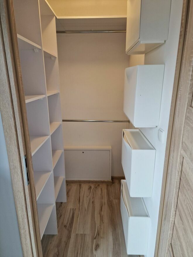 Garderoba Zabudowana szafa przy sypialni, podświetlenie LED i ergonomiczne podziały na ubrania i dodatki.