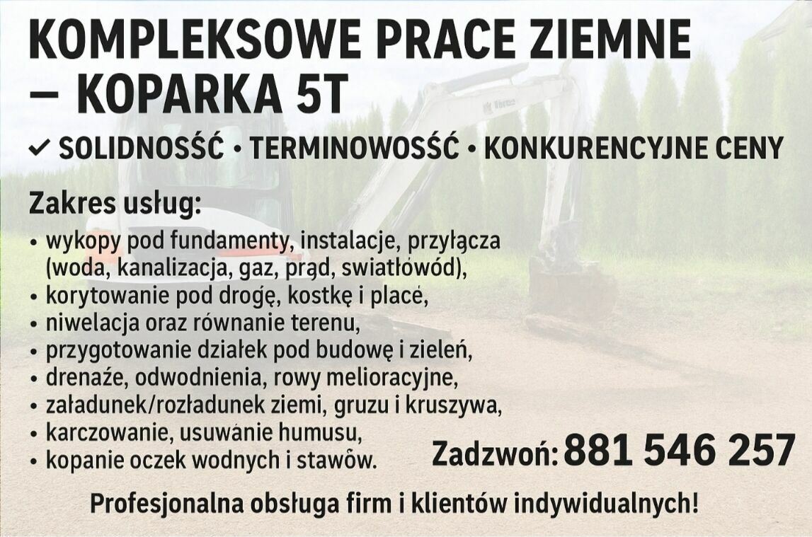 Usługi koparka 5t-Wykopy podfundamenty, instalacje, przlacza